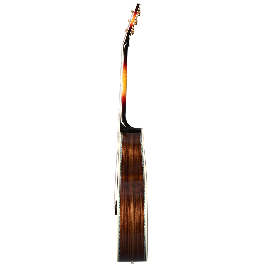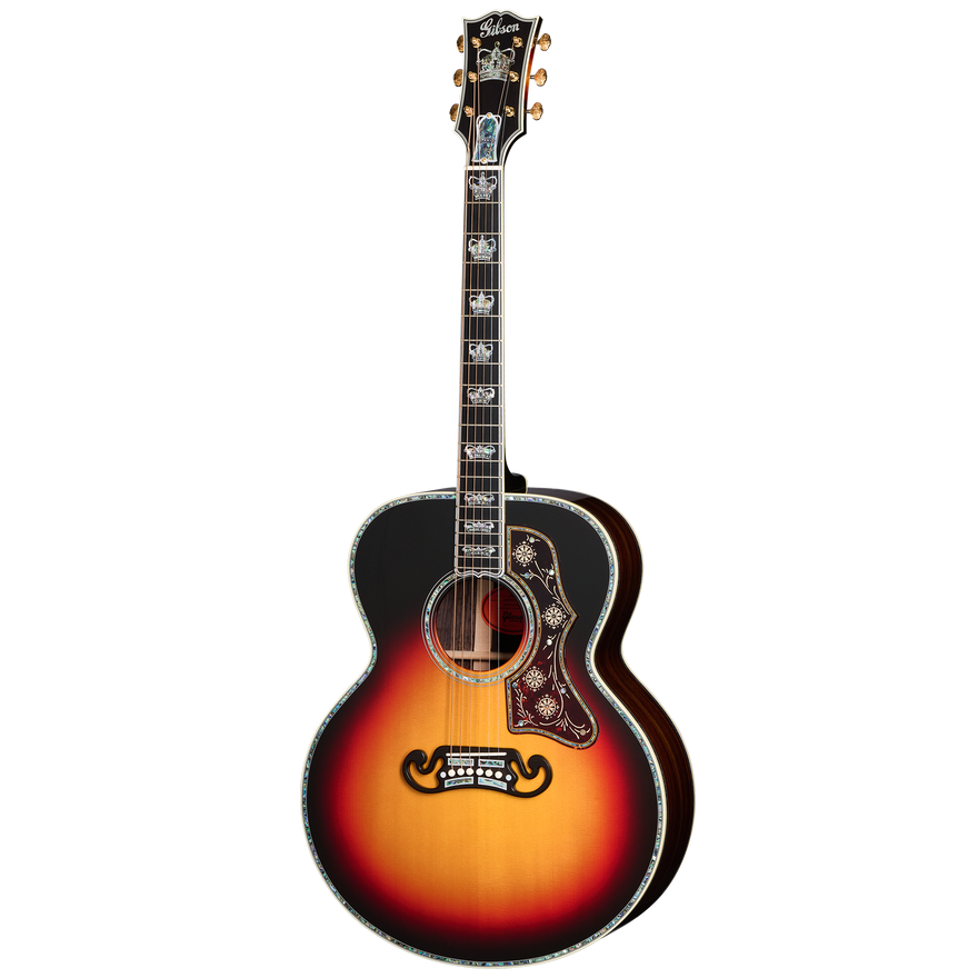 First created in the mid-1990s, the SJ-200 Monarch has become the ultimate custom edition of Gibson’s world-famous Super Jumbo acoustic guitar. This museum-worthy masterpiece SJ-200 Monarch Rosewood is truly a one-of-a-kind art piece. Due to the considerable amount of handwork and customization done by our highly skilled artisans, the SJ-200 Monarch is an exceedingly rare model from the Gibson Custom team in Bozeman, Montana, and each one is individually and sequentially numbered on the back of the headstock near the serial number. The SJ-200 Monarch Rosewood features AAA Indian rosewood back and sides, a AAA Sitka spruce top, a AAA maple neck with a rounded profile and ebony fretboard, and is lavishly appointed with mother of pearl and abalone inlays, including the stunningly detailed Monarch Crown inlays on the fretboard, the mother of pearl on the four-bar Moustache™ bridge, the abalone on the multi-ply binding, the mother of pearl Gibson script headstock logo, and the mother of pearl and abalone truss rod cover and Monarch Crown inlay on the headstock. The famous SJ-200 pickguard is also adorned with an abalone border and dots. Even the serial number is presented as an engraving on a mother-of-pearl arrow inlay on the rear of the headstock. The tuners are engraved gold Waverly open gear units. The nut, bridge saddle, and bridge pins are all bone. Lovingly made by the master luthiers and craftspeople of Gibson Custom in Bozeman, Montana, a Gibson Custom hardshell case is also included to keep this King of the Flat-Tops that is worthy of royalty safe and secure when not in use.