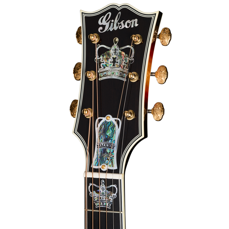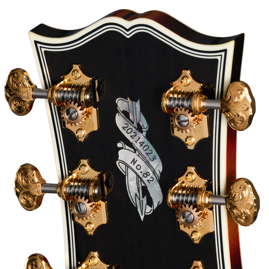 Kopfplatteneinlage Gibson Script Logo in Mother of Pearl, Hand-Engraved Monarch Crown in Mother of Pearl and Abalone; Serial Number Engraved on Mother of Pearl Arrow on Headstock Rear