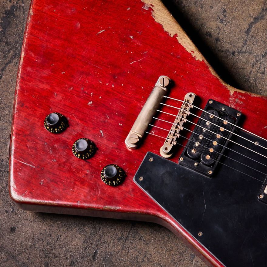 The Custom Addiction Explorer draws heavily from the spirit of the original 1958 design, as well as from a heavily aged vintage model known as “Big Ed,” one of the central inspirations for this series. After creating individual Explorers for Slash and Jason Momoa, Scala turned his attention to producing ten distinctive Explorers for the Master Artisan Collection. Each one is related in concept, yet entirely individual. The Custom Addiction Explorer is one of the three singular builds in the collection, and it stands apart with a deep Dark Cherry Korina finish, heavily aged lacquer work, and a voice that is as nuanced as its visual impact.
