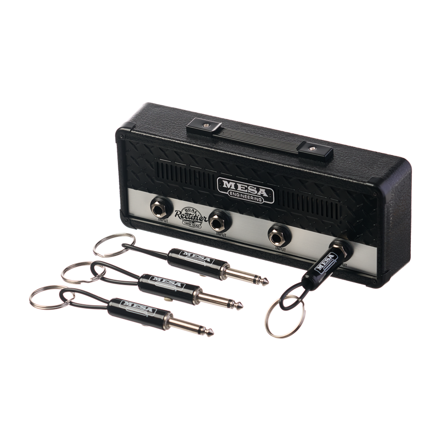 Bring the explosive power and iconic look of the Dual Rectifier® head to your daily routine with the Pluginz MESA/Boogie® Dual Rectifier Jack Rack®. Crafted from actual amp materials and featuring amp-inspired details such as corner guards, a functional handle, and bearing the legendary MESA Engineering® badge and Dual Rectifier 100W Head logo, this Jack Rack delivers an ultra-premium look and feel. It comes with four MESA®-branded guitar plug keychains that plug into the Jack Rack, just like you’d plug in a guitar cable, making it the perfect way to store your keys when you’re not using them. You can use it on a table top or wall-mount it with the included wall bracket and hardware.