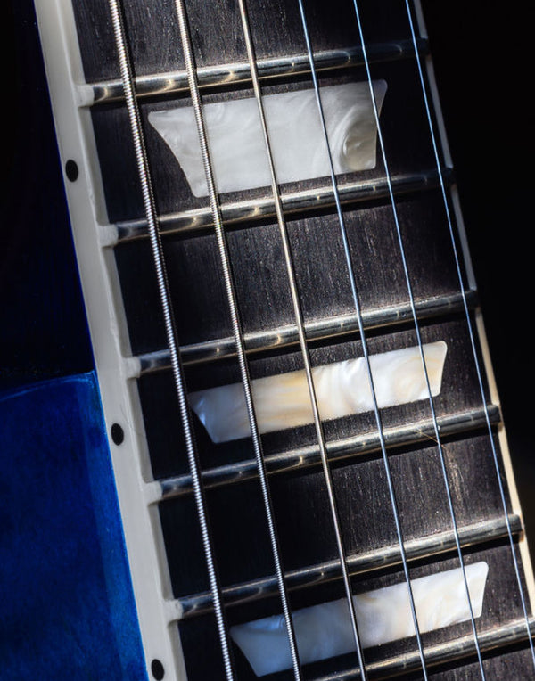 - A bound ebony fretboard with acrylic trapezoid inlays