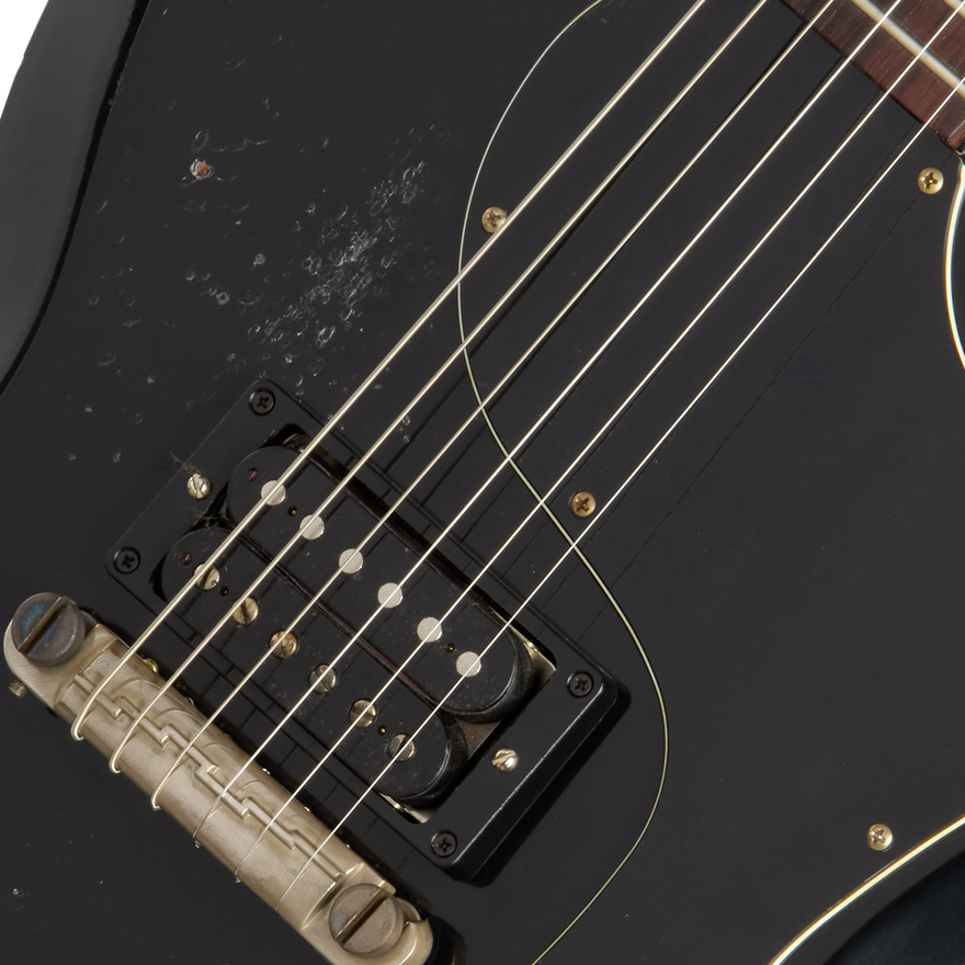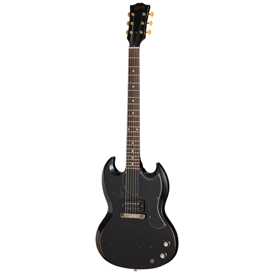 While the guitar is not available as a standard production model, the Gibson Custom 1963 SG Junior Reissue is available through Made to Measure and Gibson Custom Select. Instead of the standard Dogear P-90 pickup typically fitted in the bridge position, this SG Junior features an uncovered Double Black Custombucker, which complements the all-black aesthetic and custom Ebony finish. The guitar was sent through the Murphy Lab and given the Heavy Aged treatment, which makes it look as if it went on tour all around the world. The idea of this design came from vintage guitars that were modified for humbuckers in the 1970s, refinished, and played every night for decades. Now available straight from Gibson Custom, this take on an alternative history of this model not only makes for a unique story but also a unique sound and aesthetic.