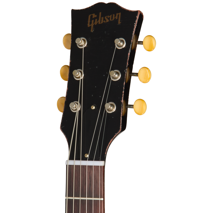 The Gibson SG Junior followed the previous two shapes of the Les Paul Junior that were originally made available between 1954 and 1960. Nearly 10 years after its initial release, the Junior platform retained its core attributes that have made the model attractive to players who want a bare-bones approach to their guitar. Fitted with a wraparound bridge and a Dogear P-90 pickup mounted directly to the body of the guitar, the SG Junior and Les Paul Junior have everything you need and nothing you don’t. These models are also defined by their stripped-down aesthetics, which include unbound fretboards with dot inlays and a silk-screened Gibson logo. All the features that made the Les Paul Junior so simple translated directly to the SG body shape, which continued the legacy of the model. The SG Junior had minor tweaks throughout the model’s original design, which started in 1961. The neck initially had a very slim profile and gradually became thicker until the middle of 1965, when the nut width changed to a narrower width.