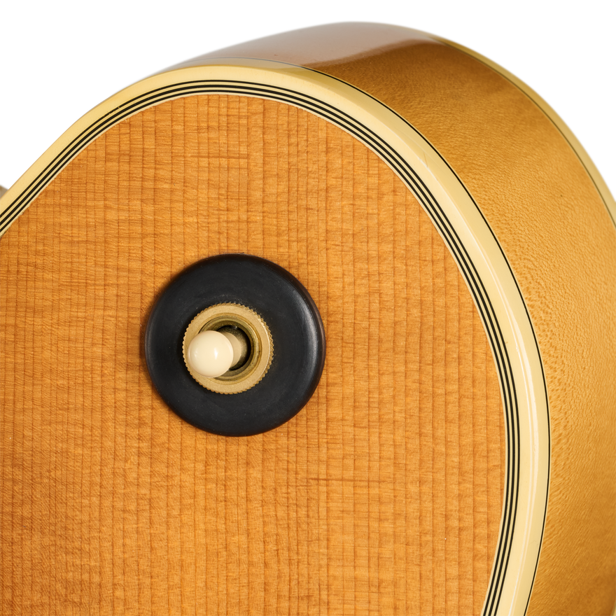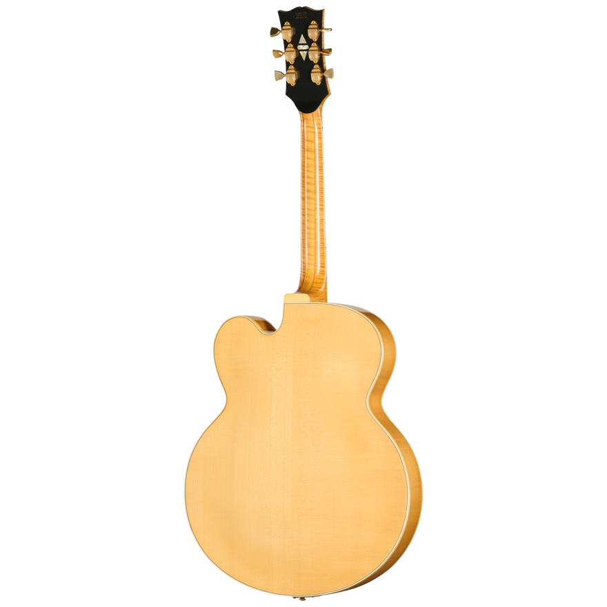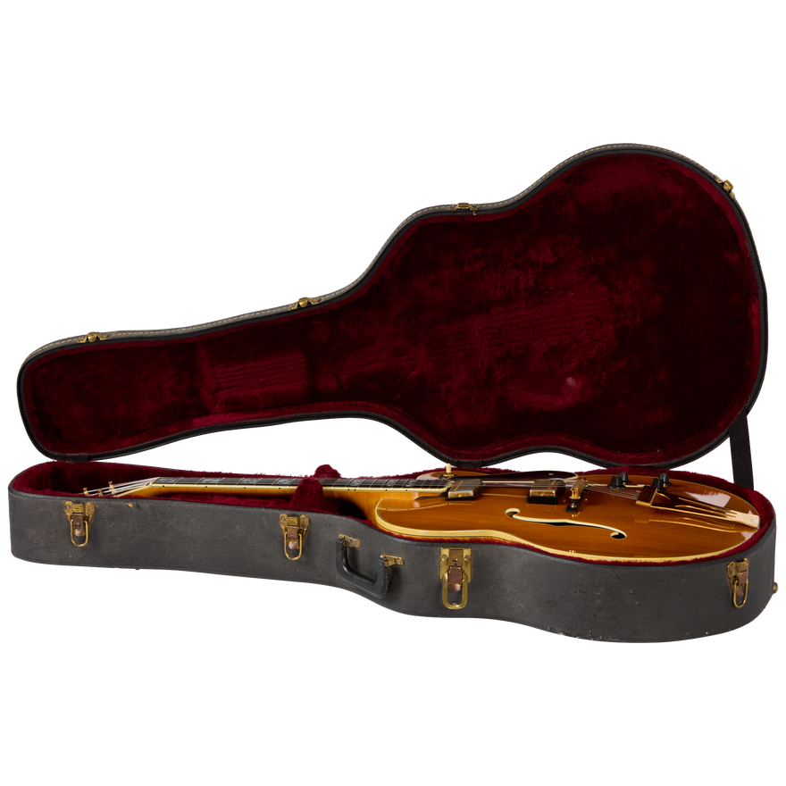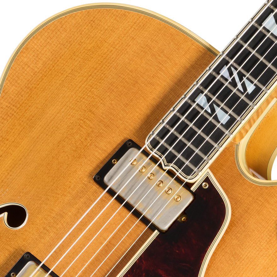 There is almost no checking on the guitar, no fret wear, and it remains in outstanding cosmetic condition overall. The only aesthetic changes from when it left the factory are in the hardware, with moderate tarnishing on the pickups and light tarnishing on the tailpiece, tuners, and bridge. It’s a beautifully preserved example of Gibson’s most prestigious archtop