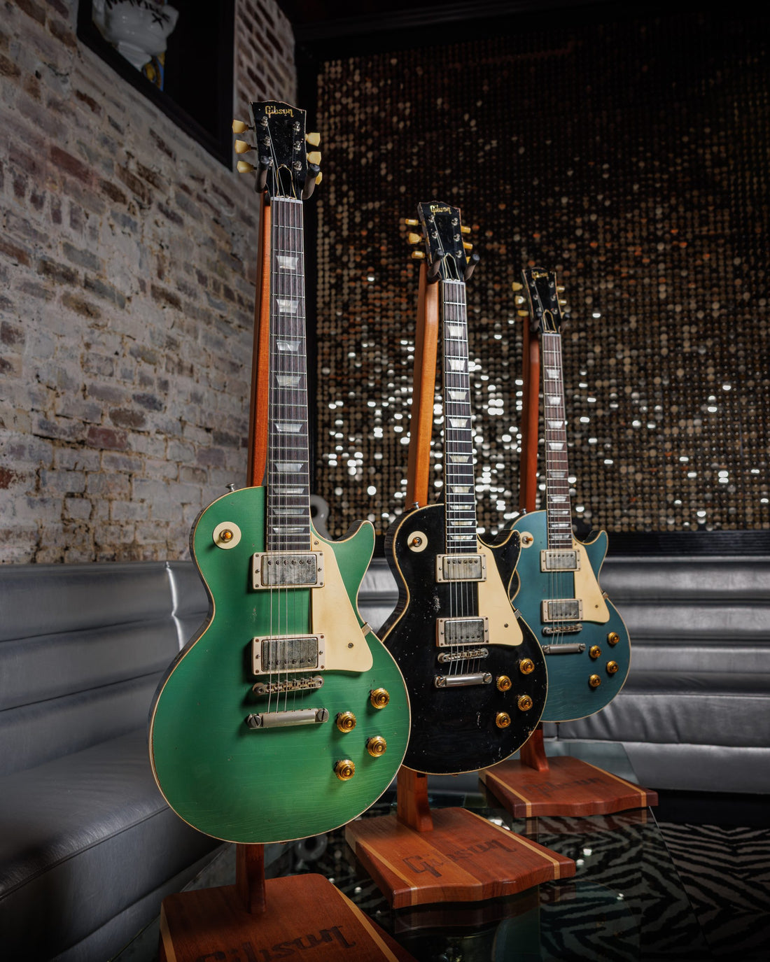 Featuring three different colorways, this series of 1957 Les Paul Standard Reissue guitars has unique features that are rare to find on a ’57 Les Paul Standard. The first is the finish process, which was inspired by those vintage guitars that didn’t make it through the decades with their original finish intact. The idea here is that all three guitars started life as a Goldtop, but each subsequently had a different color sprayed over the top. As the refinish wore through, the original gold began to reappear—a process that will continue over time.