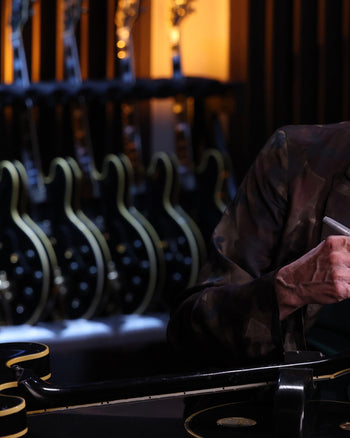 The Gibson Custom Keith Richards 1960 ES-355 Collector’s Edition features a multi-ply bound, three-ply maple/poplar/maple body with red spruce bracing and a weight-relieved maple centerblock for sustain and feedback resistance. The mahogany neck has a Custom Keith Richards neck profile taken from 3D scans of the original guitar, measuring approximately .801” at the first fret, .905” at the 12th fret, and 1.625” wide at the nut. The bound ebony fretboard features mother-of-pearl block inlays and the same Medium Wide fretwire as the original guitar. Hardware includes a Bigsby® B7 vibrato tailpiece and Grover® Rotomatic® tuners with Milk Bottle buttons, and the metal parts, plastics, and Ebony nitrocellulose finish have been expertly aged by our Murphy Lab artisans to match the wear and aging that Keith has added to the guitar through decades of sessions and tours. The guitar’s unmistakable tone is powered by a pair of unpotted Custombucker pickups with Alnico 5 magnets, handwired to CTS® 500k audio taper pots and paper-in-oil tone capacitors. Together, they recreate the sonic majesty of the original.