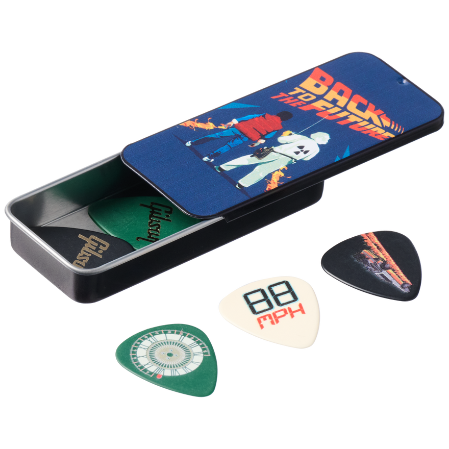This collectible Back to the Future-themed pick tin contains six guitar picks featuring various artwork from Back to the Future. Made in the USA.