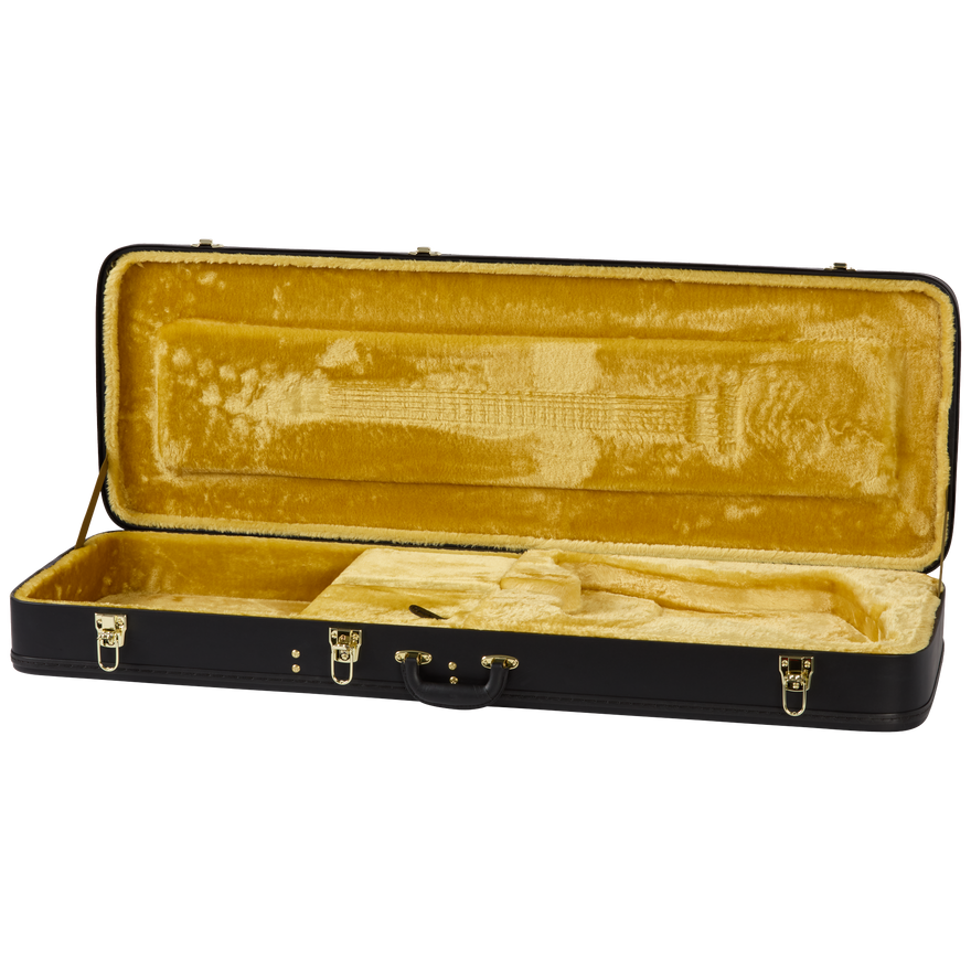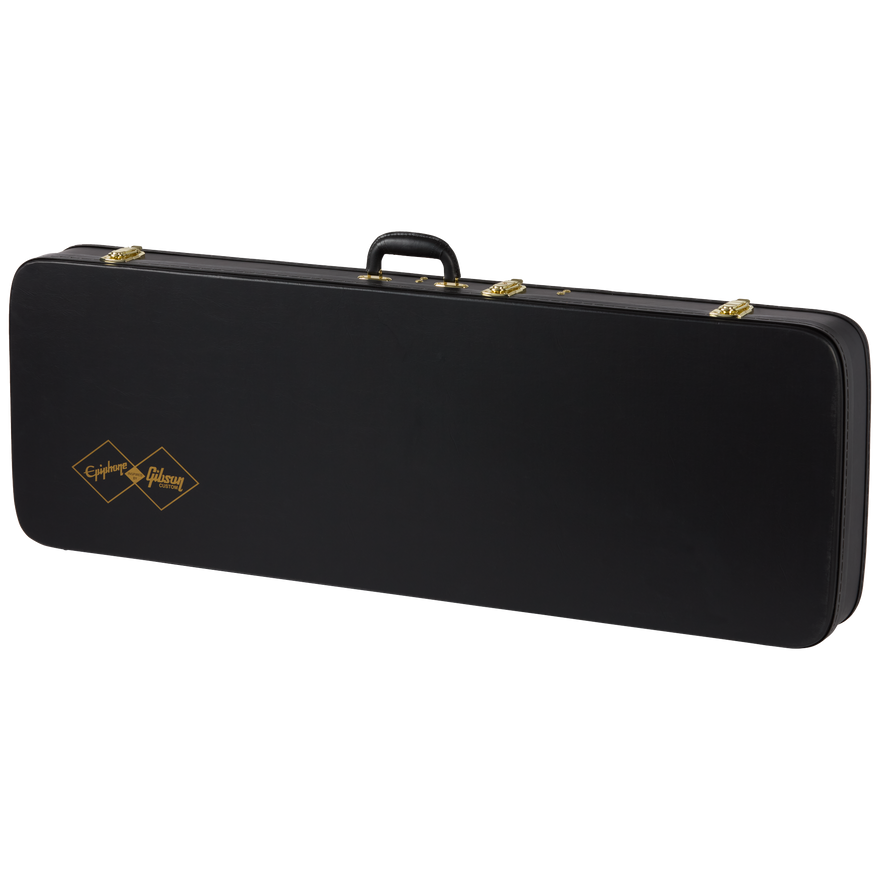 The updated Epiphone Inspired by Gibson Custom 1963 Firebird V with Maestro Vibrola delivers vintage Firebird specifications at an accessible price. The vintage-inspired features include a 9-ply neck-through-body made of mahogany and walnut with mahogany body wings to either side of the neck. This construction method results in the tuners, pickup, and bridge all being anchored into the same pieces of wood for exceptional resonance, sustain, and tonal transfer between them. The neck features a SlimTaper™ Rounded C profile with soft fretboard edges for a comfortable, played-in feel. The rosewood fretboard is adorned with mother-of-pearl trapezoid inlays and equipped with 22 medium jumbo frets. Even the side dot position markers are the same size as on vintage Firebirds and placed in historically accurate locations. Kluson® planetary geared “banjo” tuners anchor the strings at the headstock and further add to the historic Firebird look, while an Epiphone ABR-1 bridge and Maestro™ Vibrola™ with an engraved Epiphone logo hold things down at the other end. The electronics are also premium and include Gibson USA Firebird mini humbucker™ pickups with Alnico 5 magnets, CTS® potentiometers, Mallory™ capacitors, and a Switchcraft® 3-way pickup selector toggle switch and 1/4” output jack, giving this remarkable recreation not only the look but also the sound of a classic Firebird V. An Epiphone Inspired by Gibson Custom hardshell case is also included.