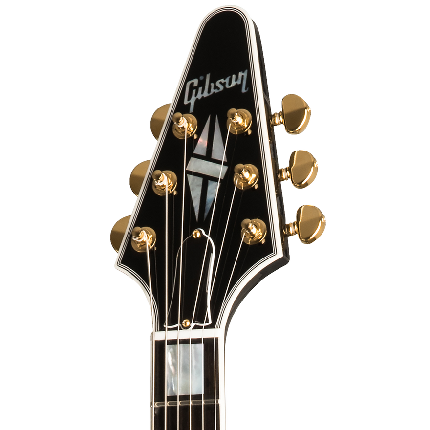 The Flying V Custom adds upscale "Black Beauty" appointments to one of Gibson's boldest, most legendary designs. The result is guitar that exudes style and distinction -- a statement piece backed up with unparalleled Gibson tone and playability. From the solid ebony fingerboard to the split-diamond headstock inlay, it is an undeniable modern classic worthy of the "Custom" name.