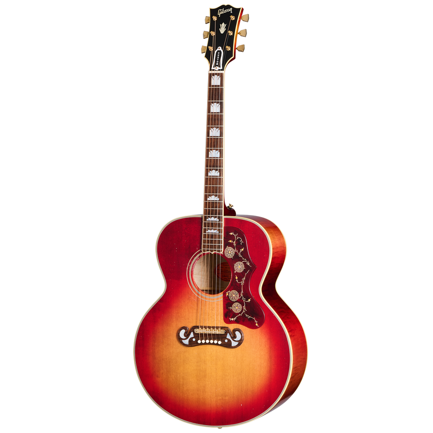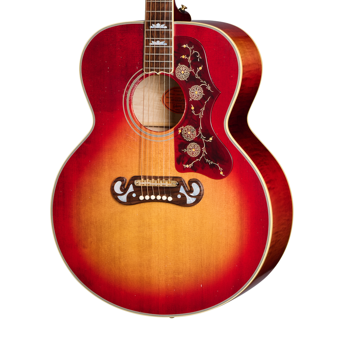 One of the most iconic guitarists in history is Jimmy Page, and his acoustic guitar of choice when recording Led Zeppelin’s debut album was a mid-60s Gibson SJ-200™ that he played on multiple songs on that legendary record. Jimmy also used this guitar in his brilliant solo appearance on the Julie Felix Show on April 26, 1970, where he performed “White Summer/Black Mountain Side.” Made in close collaboration and with significant input from Jimmy Page on everything from the sonic character and wear to the playability and even the vivid Cherry Tea sunburst finish, this very special recreation features highly flamed AAA maple for the back and sides, along with AAA Sitka spruce for the top. The Super Jumbo body has multi-ply binding on the top and back, and is slightly deeper than a standard SJ-200 at the neck joint, contributing to its unique sound that’s not quite like any other SJ-200.
