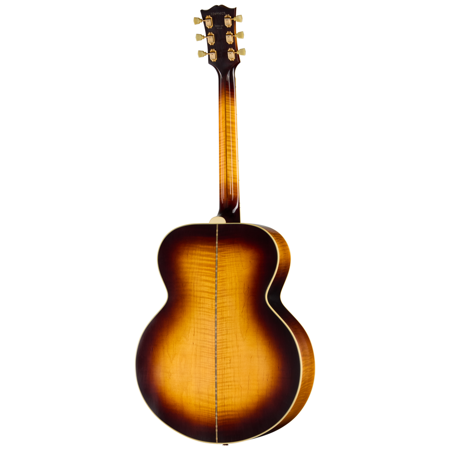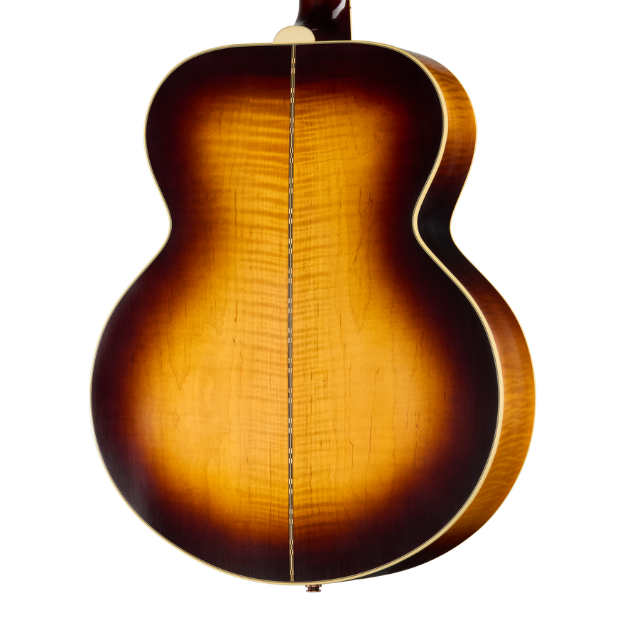 Known as the “King of the Flat-tops,” the Gibson SJ-200 is the largest acoustic guitar in the Gibson lineup. This Gibson Custom Select 1957 SJ-200 features a thermally aged Sitka spruce top that mimics the aging of a decades-old spruce top on a vintage instrument. Over time, the sugars in the spruce will crystallize, giving the wood a unique character common to vintage guitars. AAA flame maple is featured on the back and sides of the guitar, showcasing the level of figured tonewoods used in Gibson Custom instruments. The iconic 4-bar Moustache™ SJ-200 bridge is meticulously crafted from a piece of ebony. The fretboard is also ebony and glued to a three-piece AAA flame maple neck. The headstock finishes off the classic SJ-200 aesthetic with an inlaid block Gibson logo and crown with Kluson® Deluxe tuners with Keystone buttons.