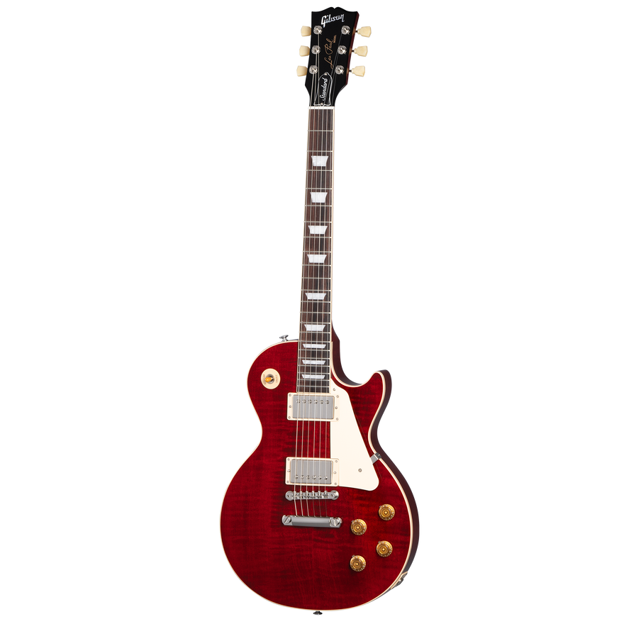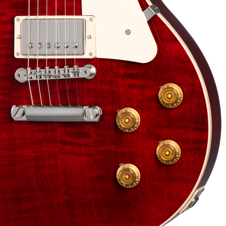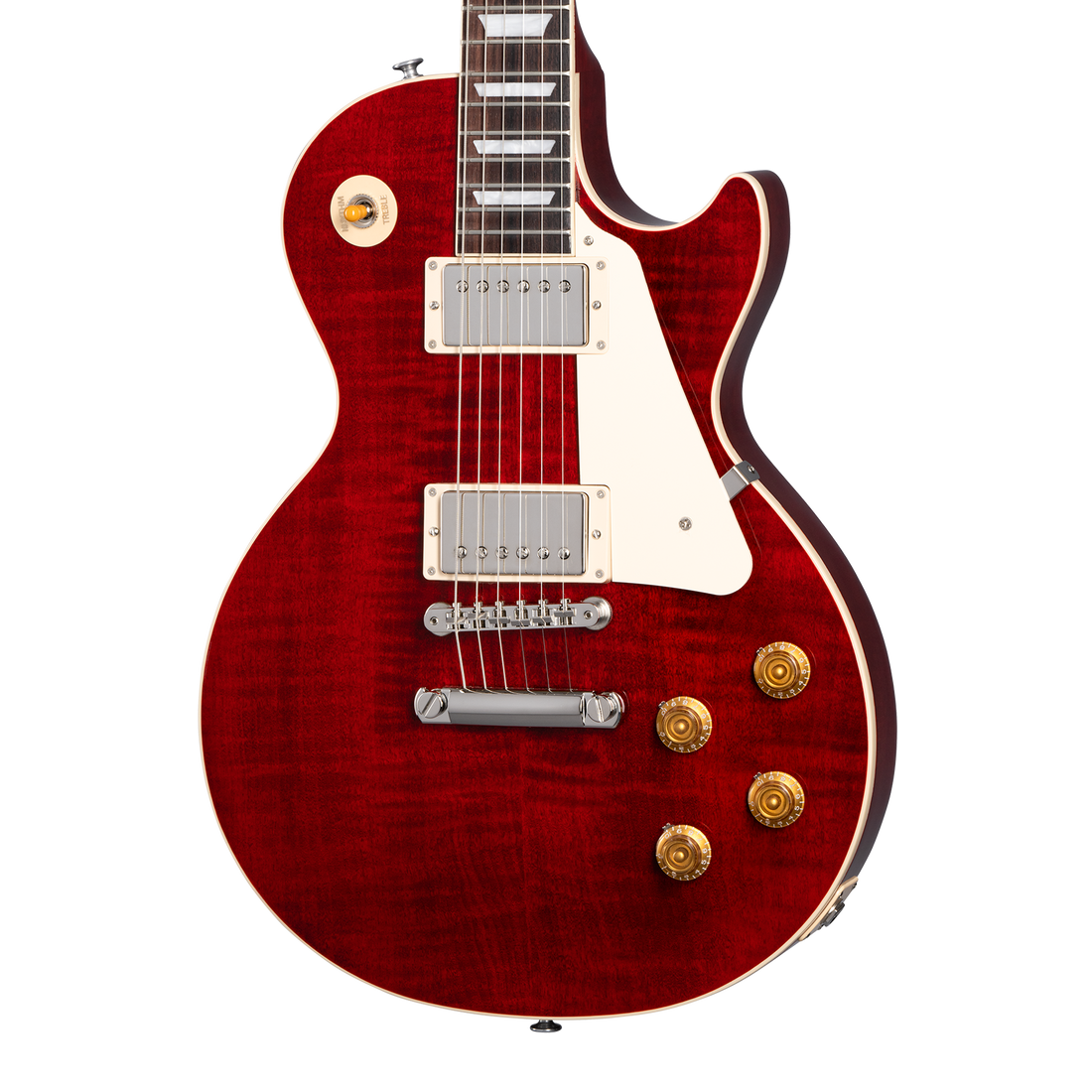 The Les Paul™ Standard 50s Figured Top returns to the classic design that made it relevant, played, and loved – shaping sound across generations and genres of music. It pays tribute to Gibson's Golden Era of Innovation and brings authenticity back to life. It boasts a solid mahogany body, an AA figured maple top, and a distinctive translucent custom color nitrocellulose lacquer finish that showcases the figured maple top. The mahogany neck has a rounded 50s Vintage profile and a rosewood fingerboard with trapezoid inlays. The Les Paul Standard 50s Figured Top is equipped with an ABR-1, the classic-style Tune-O-Matic™ bridge, an aluminum Stop Bar tailpiece, Vintage Deluxe tuners with Keystone buttons, and gold Top Hat knobs. The calibrated Burstbucker™ 1 (neck) and Burstbucker 2 (bridge) pickups are loaded with Alnico 2 magnets and wired to audio taper potentiometers and Orange Drop® capacitors. A hardshell case is also included.