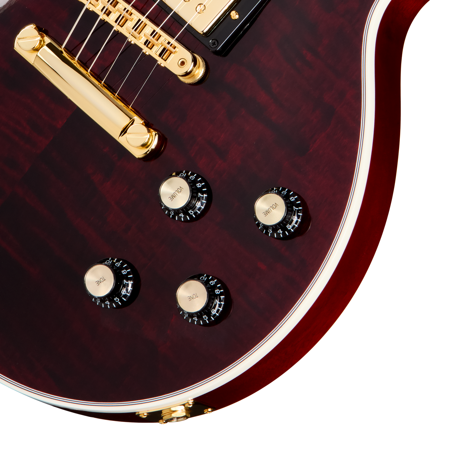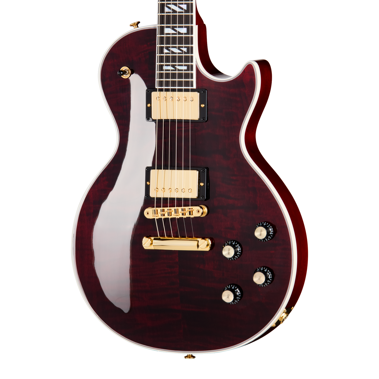 Gibson is excited to announce the return of the Les Paul™ Supreme. With a refreshed feature set, it is bound to overshadow everything else in sight and be one of the most exciting new releases of the year. It features a beautiful AAA-figured maple top on a mahogany body with Ultra-Modern Weight Relief. The mahogany neck has an ebony fretboard with a compound radius and Super Split Block mother-of-pearl inlays. The neck has a Modern Contoured Heel for exceptional upper fret access, and the headstock is adorned with a striking new mother-of-pearl inlay inspired by a design from the 1940s that was discovered in the Gibson archives. The Burstbucker™ Pro and Burstbucker Pro + pickups are paired with push/pull Volume and Tone potentiometers for flexible coil tap, phase, and Pure Bypass switching (individual push/pull volume controls for flexible coil tap switching and a Master Tone control on the 3-pickup model). The gorgeous finishes are elegantly highlighted with gold hardware, making this not only a great-sounding and highly flexible instrument but also an exceptionally beautiful-looking modern rock machine. A hardshell case is also included.