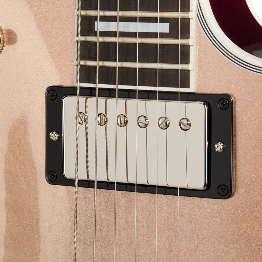 This Mod Collection 2025 Les Paul™ Custom has a Prism Peachtop finish. The modifications consist of the Mod Collection-exclusive custom finish with a bursted dark natural back, mixed hardware with black nickel Grover® tuners, black chrome tuner washers, and a black nickel Tune-O-Matic™ bridge and Stop Bar tailpiece, black Top Hat knobs, no pickguard, and nickel-covered Burstbucker™ ’61 neck and T-Type bridge pickups. It weighs 9.2 pounds and comes with a hardshell case and two-year playability warranty.