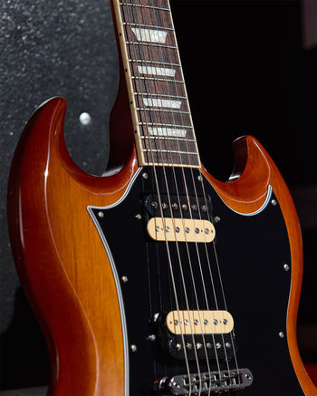 The Sadler Vaden SG Standard features a solid mahogany body with the double-cutaway design and deep body bevels that make the SG instantly recognizable and extremely comfortable to hold and play. The Natural Burst finish, rendered in gloss nitrocellulose lacquer, has been carefully matched to capture the shading of the 21-year-old aged finish of his guitar, which has warmed and browned over time.