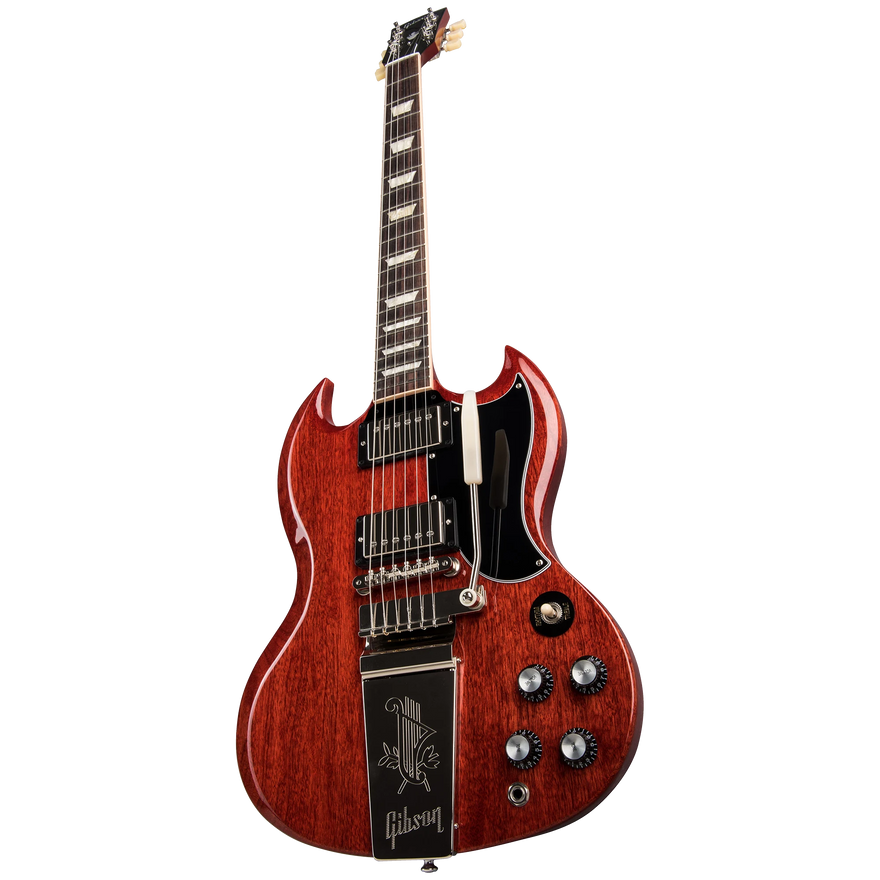 The SG™ Standard ‘61 Maestro™ Vibrola™ returns to the classic design that made it relevant, played, and loved -- shaping sound across generations and genres of music. As the name implies, the Gibson SG Standard '61 Maestro Vibrola adds vibrato capability to the SG Standard '61. The Maestro Vibrola offers smooth vibrato effects and the classic styling of the Lyre engraving on the tailpiece cover. Standard features include a SlimTaper™ mahogany neck and a bound rosewood fingerboard. The mahogany body features a deeply sculpted body scarfing, a 5-ply teardrop pickguard, and a 22nd-fret neck joint. The nickel-plated hardware includes a classic-style Tune-O-Matic™ bridge and Keystone tuners in addition to the Maestro Vibrola Tailpiece. The pickups are 60s Burstbucker™ humbuckers™ for a classic voice with added power and top end. Controls feature audio taper potentiometers and Orange Drop® capacitors.