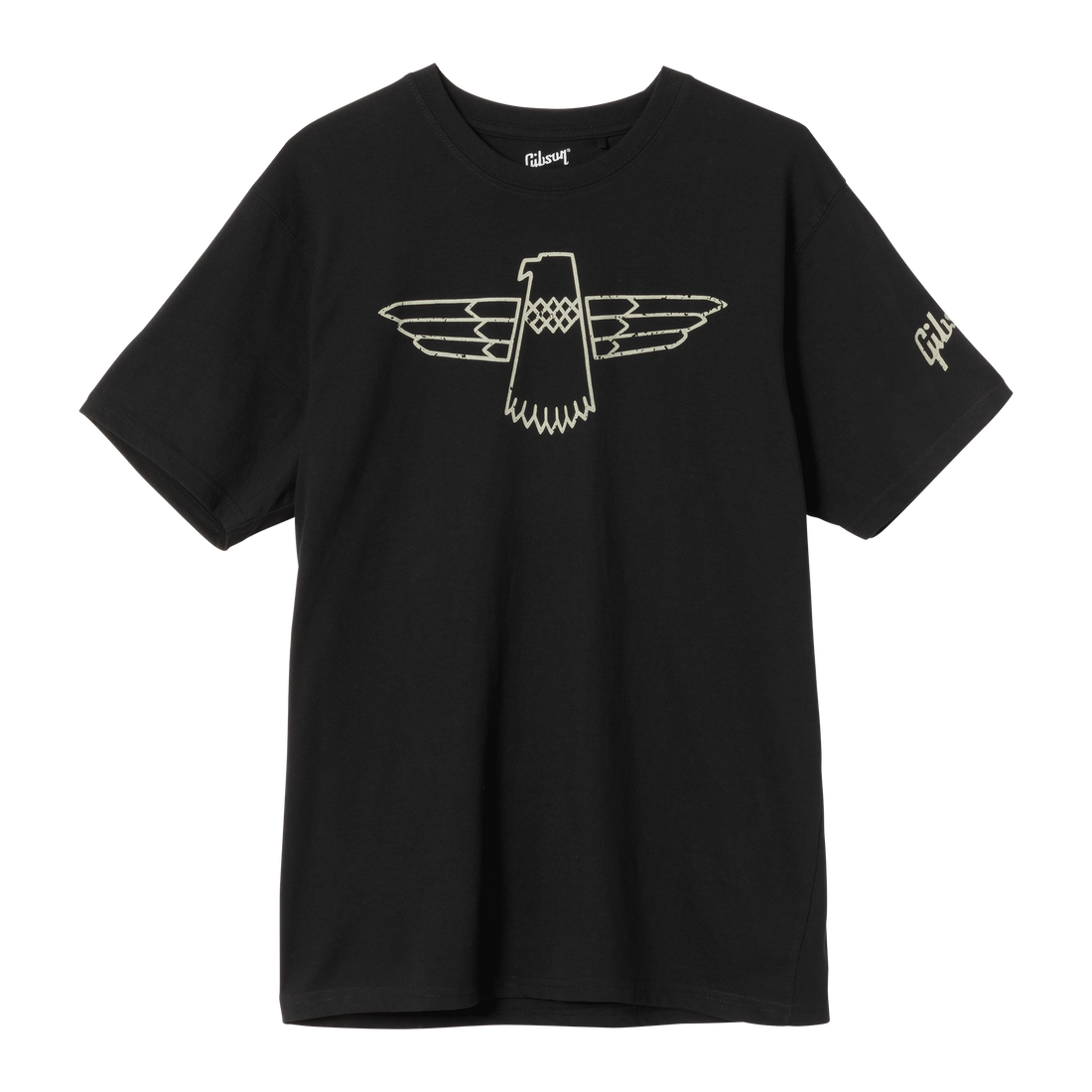 Celebrate the low-end in style with this black crew-neck T-shirt emblazoned with the stylized white emblem of Gibson's legendary Thunderbird Bass. The lightly distressed vintage-look print adorns a comfortable 60/40 cotton/polyester-blend T with matching white "Gibson" logo on the left sleeve.