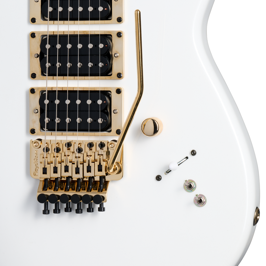 The Kramer Jersey Star is designed for players who want more - more pickups, more speed, and more in-your-face Kramer attitude! Part of Kramer’s Original Collection, the Jersey Star was first released in the 1980s and, over the years, has been one of our most popular models. This updated version features gold hardware, a three-piece maple neck with a satin finish, an elliptical C profile for speed and comfort, and a 25.5” scale length. The maple fretboard sports 22 jumbo frets and laser-cut mother-of-pearl star inlays. The alder body also features a mother-of-pearl star inlay. It packs a trio of Kramer USA Neptune humbucker™ pickups paired with a master volume control, a five-way pickup selector switch, and individual coil tap mini switches for the bridge and middle pickups. The Kramer “pointy” headstock also has a mother-of-pearl star inlay, along with a Floyd Rose® R2 locking nut that, along with the Floyd Rose 1000 Series tremolo, keeps everything solidly in tune, regardless of how wild you get with the wiggle stick acrobatics. A premium gig bag keeps this Star safe and secure, no matter where the road may take you.