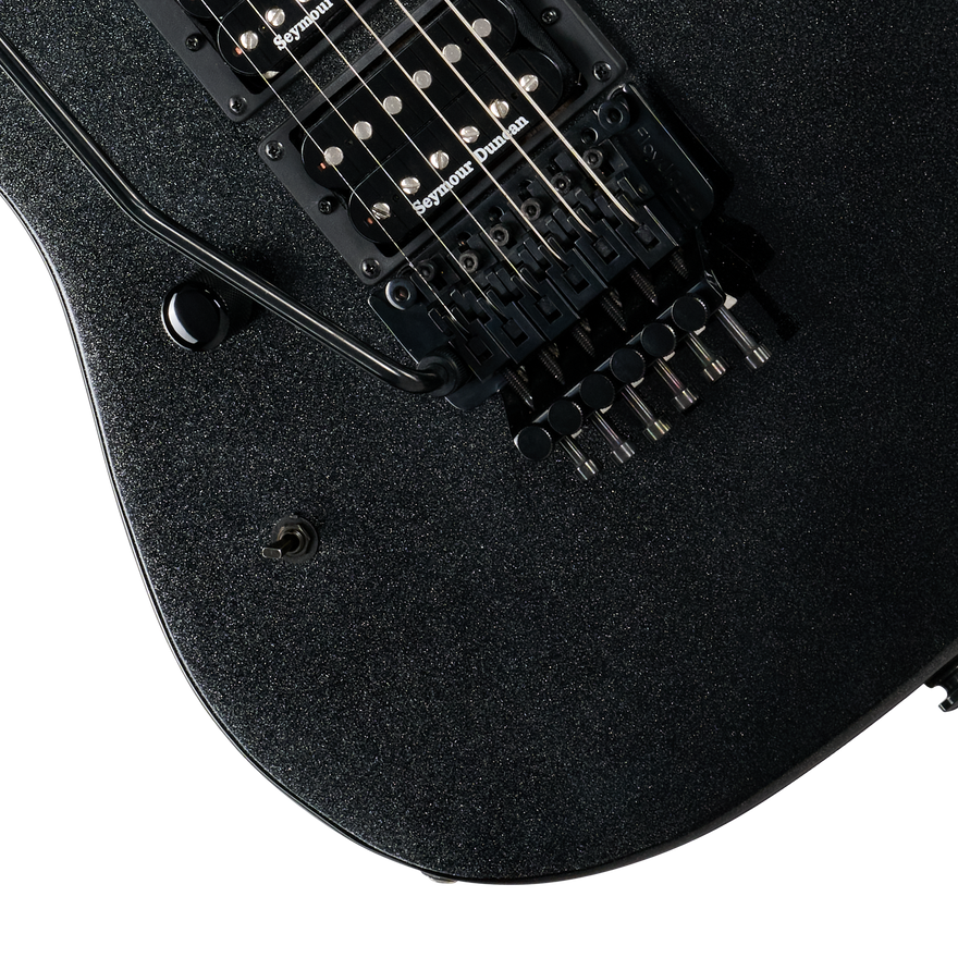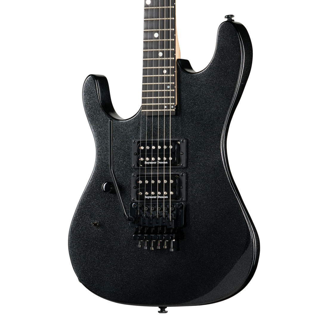 The legendary shred sled from the late 80s returns to the Kramer lineup. Featuring a double-cutaway mahogany body with a deep cut lower horn for unfettered access to all 24 jumbo frets, the NightSwan™ is powered by two Seymour Duncan® JB™ humbucking pickups and is ready for deep whammy bar dives with its Floyd Rose® 1000 Series tremolo and R2 locking nut. The ebony fingerboard has a 16" radius and features pearloid dot inlays in a distinctive "ping pong" pattern, while the back of the slim, C-shaped 3-piece hard maple neck is satin-finished, which makes it perfect for lightning-fast note flurries. This 'Swan has a gloss Jet Black Metallic, Black with Blue Polka Dots, or a Vintage White with Aztec Graphic finish and is available in both right-hand and left-hand versions. An optional hardshell case is available for right-handed models, and an optional gig bag is available that will fit either right or left-handed versions.
